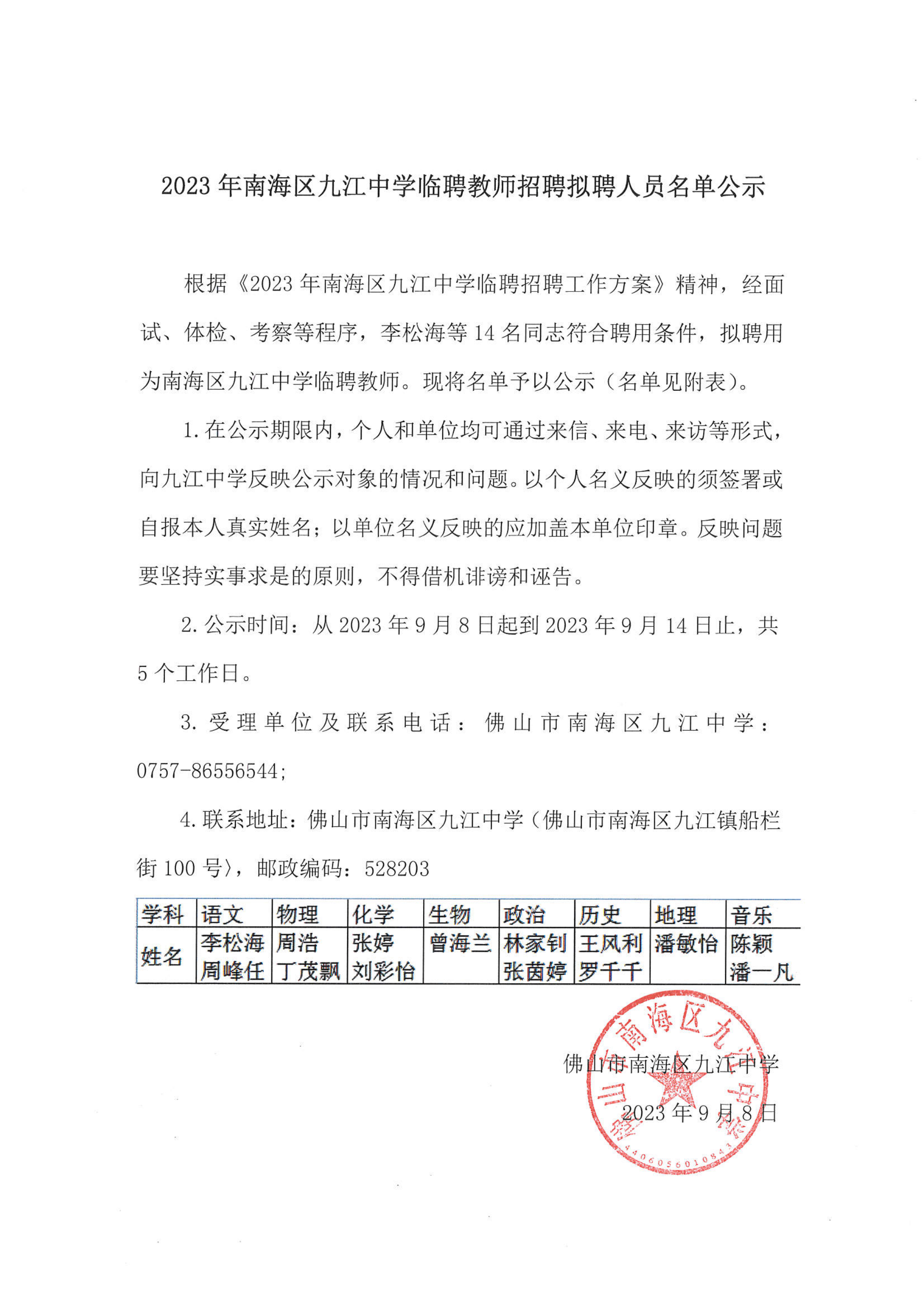 2023年南海区九江中学临聘教师招聘拟聘人员名单公示